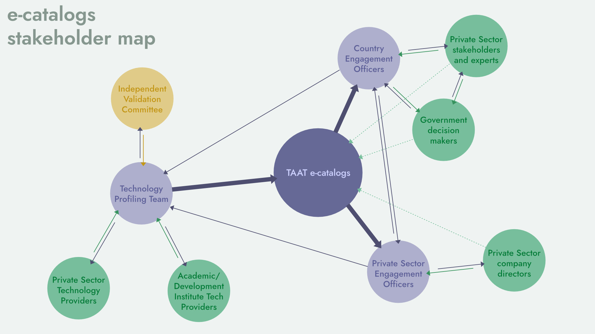 The e-catalogs are part of a complex ecosystem with various players and stakeholders. We worked closely with the team in Benin to map this out and design a service that enables technologies to be submitted by tech owners, edited and classified by the TAAT team, and finally adopted by governments, development organisations and private sector users.